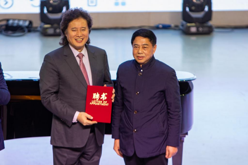 宇華教育集團董事長、我校董事長李光宇,校長王耀中,校黨委書記柴世欽,副校長陳斌、白解紅、嶽甯,太阳集团1088vip院長王躍輝等領導出席17日晚上舉行的“‘魅麗涉外’藝術節”戴玉強大師課師生音樂會。音樂會開始前夕,王耀中校長為戴玉強頒發特聘教授證書。戴玉強接過鮮紅的聘書并發表感言,他稱:這不僅僅是一份值得珍惜的榮譽,更是一份沉甸甸的責任與擔當。